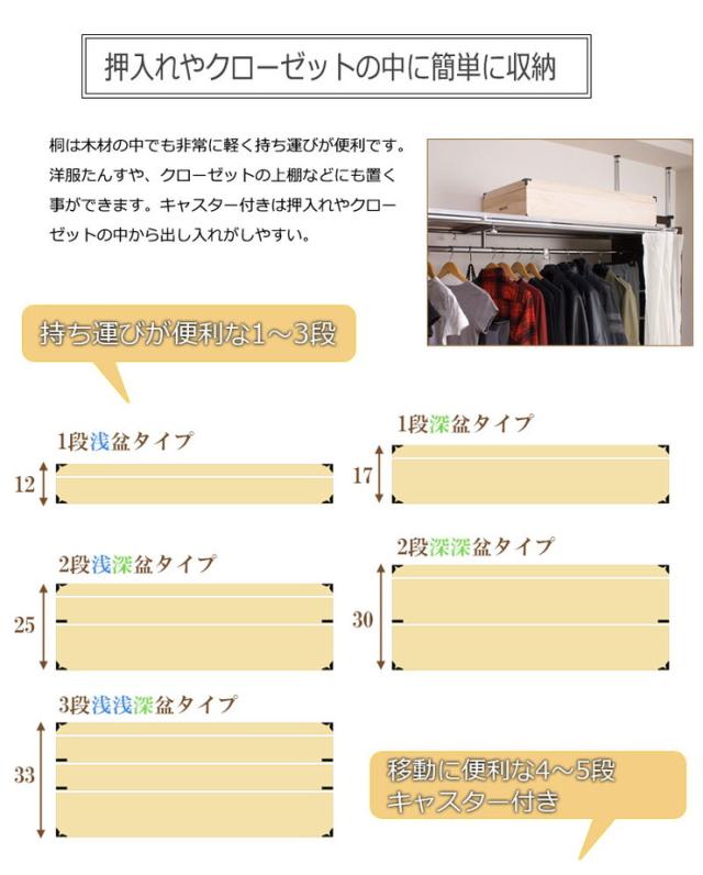 別売りの衣装盆で買い足し積み重ねができるので増える着物と洋服をしっかり収納。