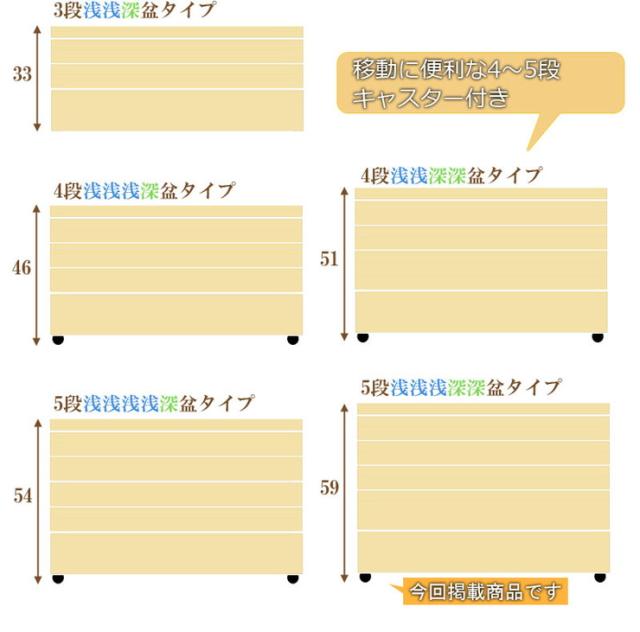 4段 高さ46cmキャスター付き | 4段 高さ51cmキャスター付き | 5段 高さ54cmキャスター付き | 5段 高さ59cmキャスター付き | 別売り浅盆 |