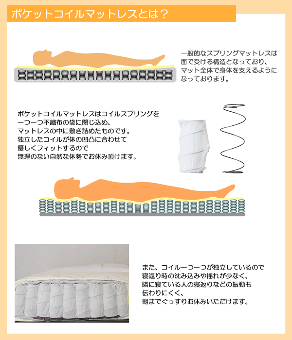 ■マットレス主材/1.9mmポケットコイルスプリング(コイル数750個)、ウレタンフォーム、抗菌・防臭フェルト、ポリエステル綿混合張地、両面多針キルティング加工