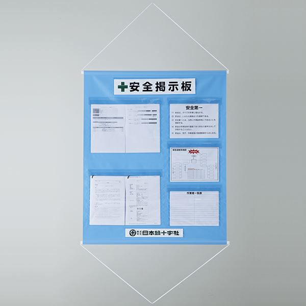 タイトル表示板(表示内容:安全掲示板)×1、社名用厚紙×1、上下パイプ・ヒモ付