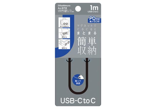 カシムラ USB充電&同期ケーブル USB-C→USB-C 綺麗にまとまるマグネット内蔵 1m 黒 USB-PD最大60W(20V3A)充電器対応 AJ-672
