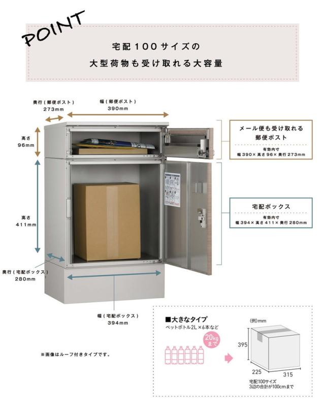 宅配サイズ100の大容量の大きさで、20kgまでの大型の荷物も受取り可能(有効内寸幅394×高さ411×奥行280mm)。