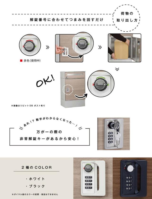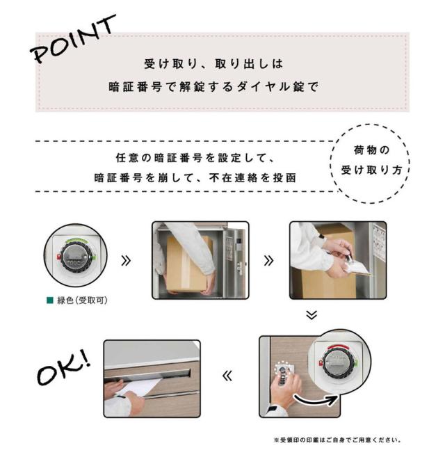 荷物の受け取りは宅配業者が任意で暗証番号を設定するダイヤル錠式です。
