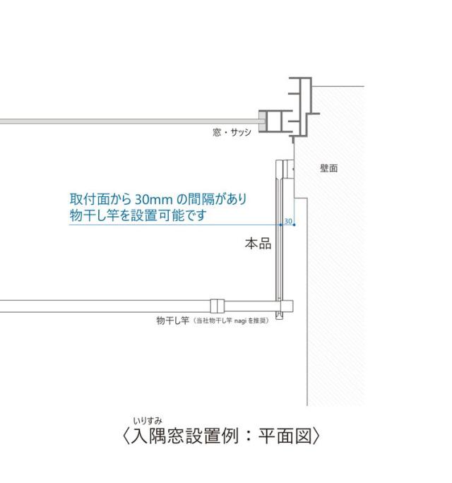 ●入隅窓でも物干し竿を掛けることができるように、 取付面から適度な間隔をもたせています。