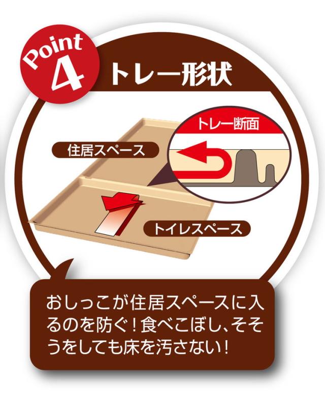 ●トレー形状・・・おしっこが住居スペースに入るのを防ぐ!食べこぼし、そそうをしても床を汚さない!