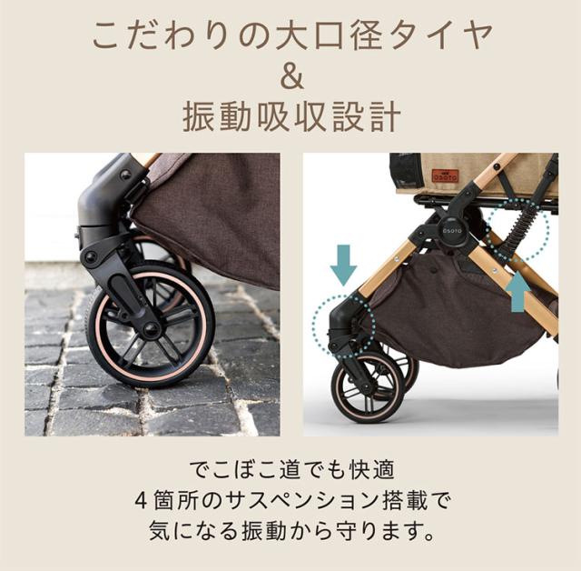 【こだわりタイヤ】大口径タイヤででこぼこ道でも快適な乗り心地&押し心地。前輪とフレームの計4ヶ所にサスペンションを搭載。気になる振動からペットをやさしく守ります。