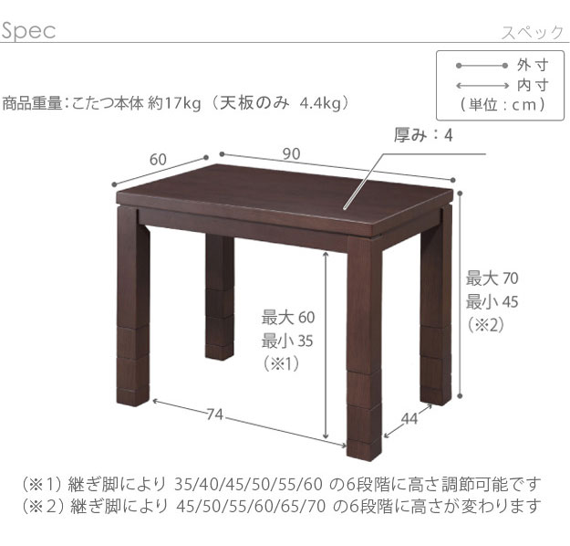 幅90x奥行60x高さ45/50/55/60/65/70cm(継ぎ脚10cmx2個 5cmx1個)