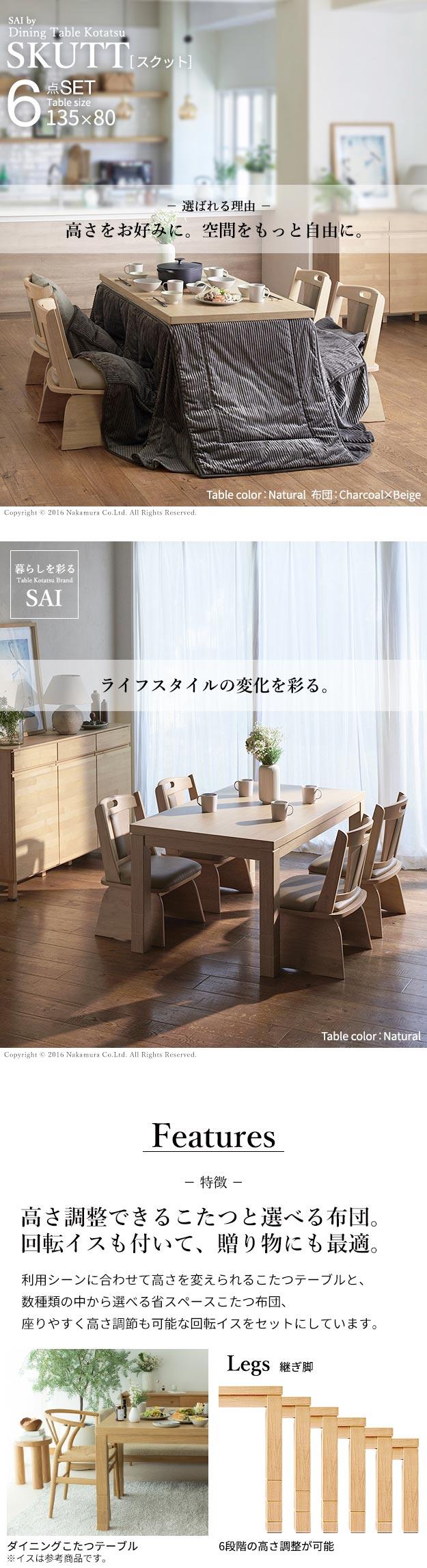 こたつ ダイニングテーブル 長方形 パワフルヒーター-6段階に高さ調節できるダイニングこたつ〔スクット〕 135x80cm 6点セット(こたつ本体+専用省スペース布団+回転椅子4脚)ハイタイプこたつ(代引不可)【送料無料】