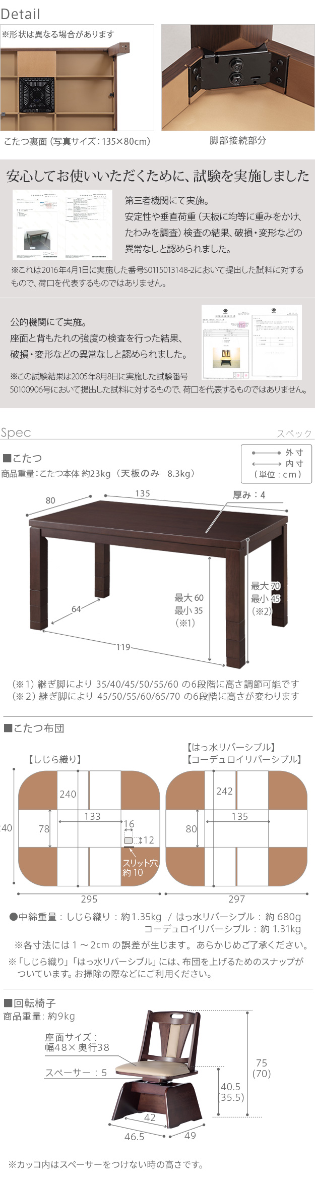 幅135x奥行80x高さ45/50/55/60/65/70cm(継ぎ脚10cmx2個 5cmx1個)・約23kg