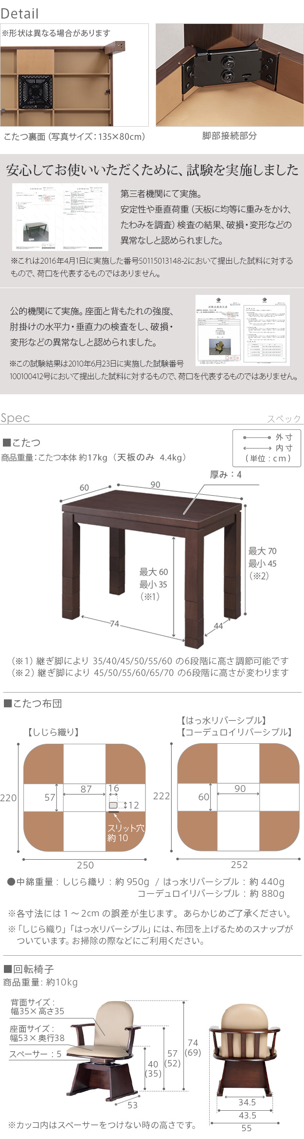 幅90x奥行60x高さ45/50/55/60/65/70cm(継ぎ脚10cmx2個 5cmx1個)・約17kg