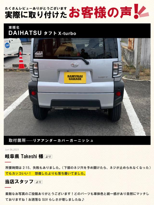 ダイハツの新型軽SUVタフト専用のリアバンパー下部に装着するドレスアップパーツです。