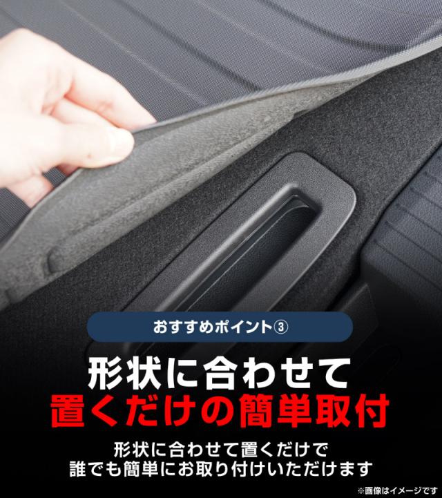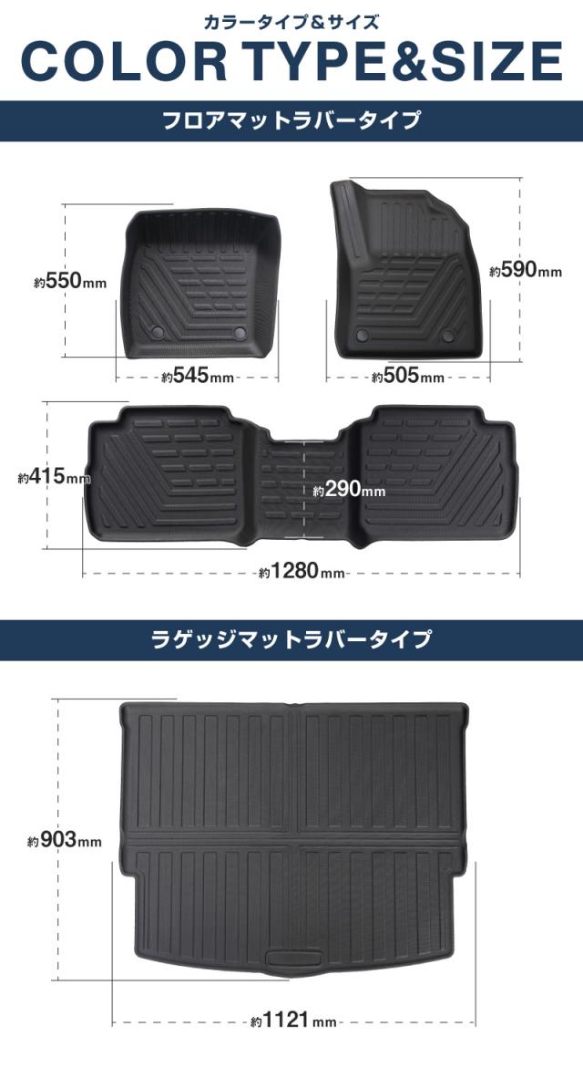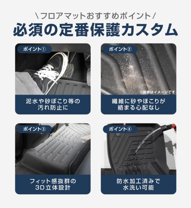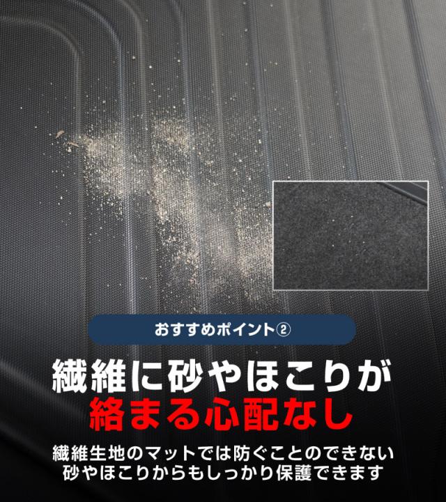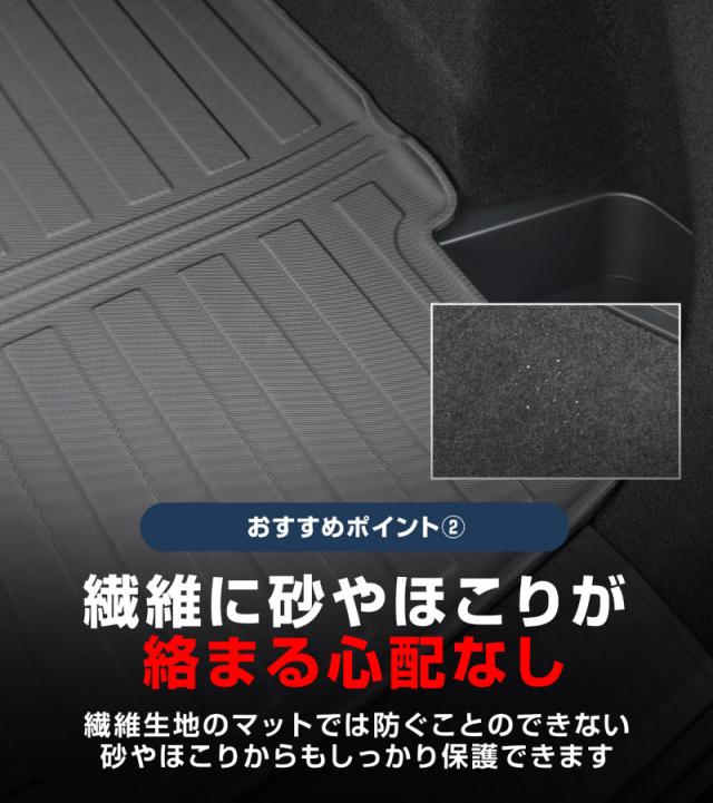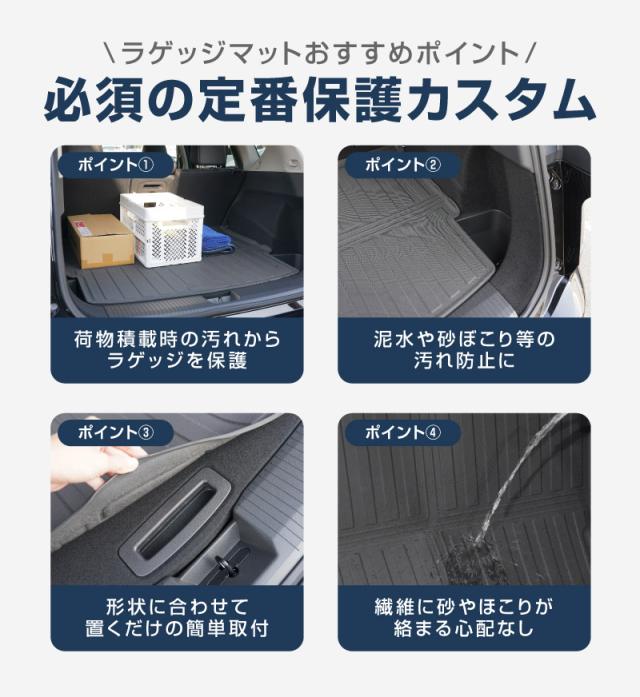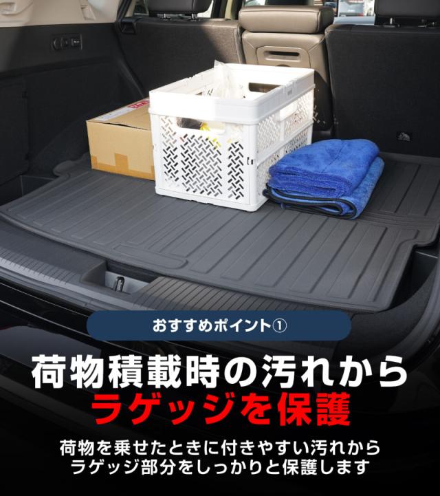運転席・助手席から後部座席まで車内のフロア全体をカバーできるフロアマットと、荷下ろし時に発生しやすい傷や汚れから保護するラゲッジマットがフロアから荷室までをカバーします。