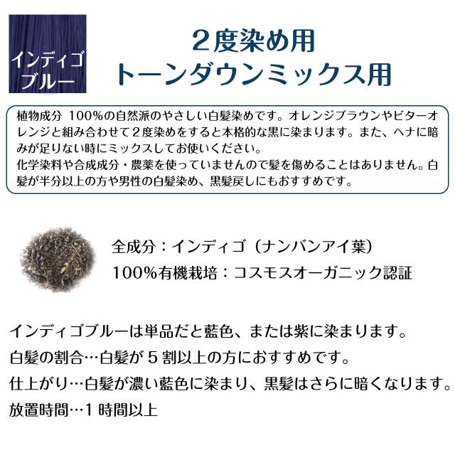オレンジブラウンやビターオレンジと組み合わせて2度染めをすると本格的な黒に染まります。また、ヘナに暗みが足りない時にミックスしてお使いください。