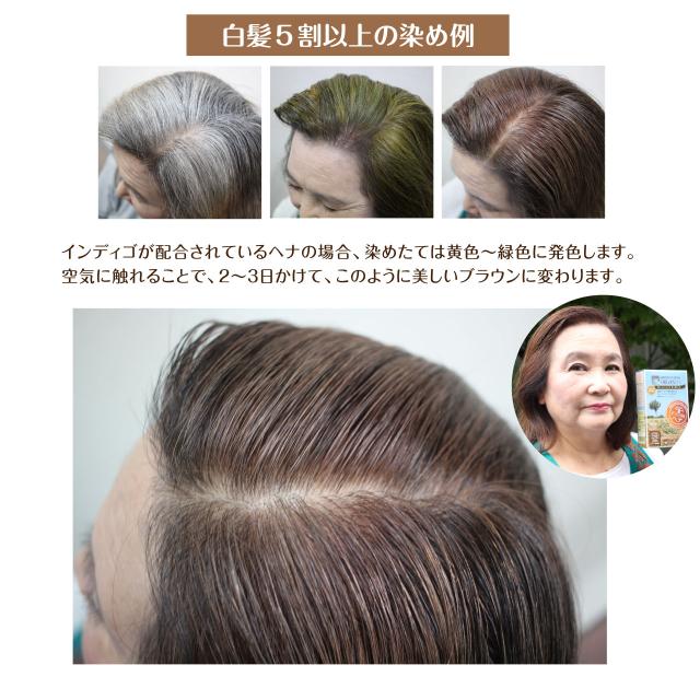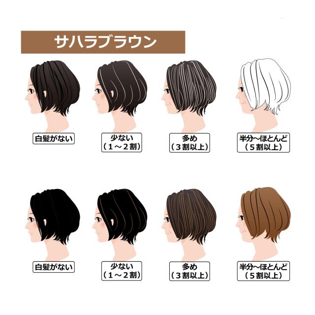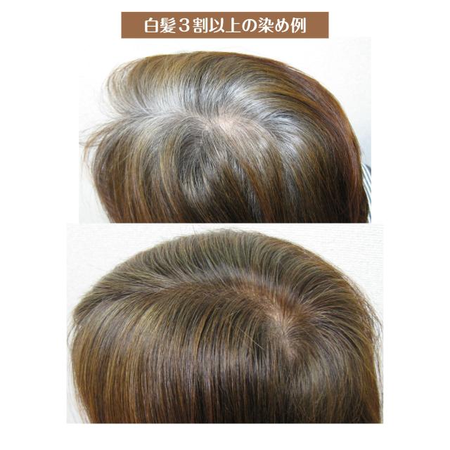 仕上がり…白髪が明るい茶色に染まり、黒髪はやや暗くなります。
