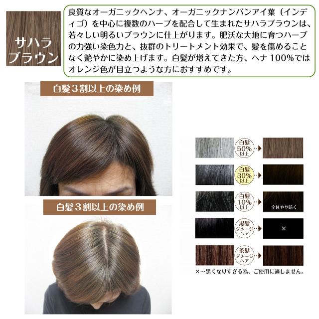 良質なオーガニックヘンナ、オーガニックナンバンアイ葉(インディゴ)を中心に複数のハーブを配合して生まれたサハラブラウンは、若々しい明るいブラウンに仕上がります。肥沃な大地に育つハーブの力強い染色力と、抜群のトリートメント効果で、髪を傷めることなく艶やかに染め上げます。白髪が増えてきた方、ヘナ100%ではオレンジ色が目立つような方におすすめです。
