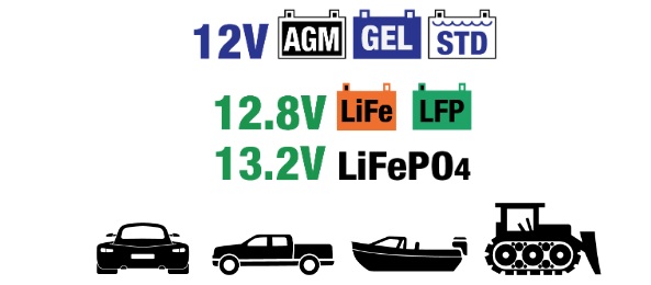 ・12V鉛蓄電池および12.8V/13.2V LiFeP04 / LFPリチウム電池に最適です