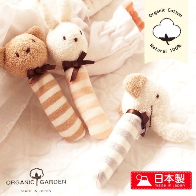 日本製 オーガニックコットン100 ベビーラトル スティックがらがら にぎにぎ 新生児 赤ちゃん用 おもちゃ ファーストトイ くま ぞう うさぎ 男の子 女の子にも ガラガラ ベビー用品 ギフト 御祝 出産祝い organic garden