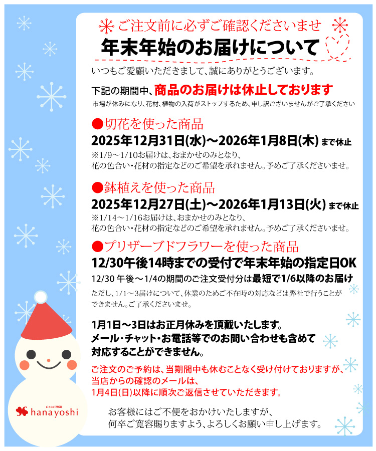 このたびの改定により、お客様にはご負担をおかけしてしまうことに、私どもも心苦しい思いでおります。しかしながら、これからも皆さまにお喜びいただけるお花をお届けするために、品質の維持とサービスの向上に努めてまいりますので、何卒ご理解いただけますと幸いです。
