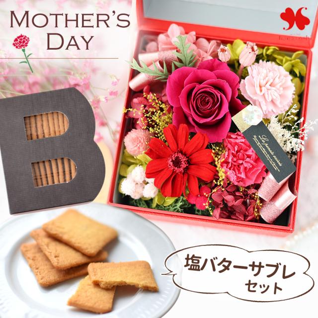 母の日 2026 プレゼント 花 ギフト プリザーブドフラワー hana*cube母の日ver と スイーツ 塩バターサブレ 焼き菓子 サブレ 母の日限定