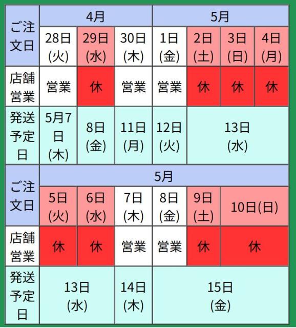 ゴールデンウィーク期間中の発送予定について