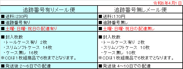 【追跡番号無しメール便】や【追跡番号有りメール便】もご選択頂けます。