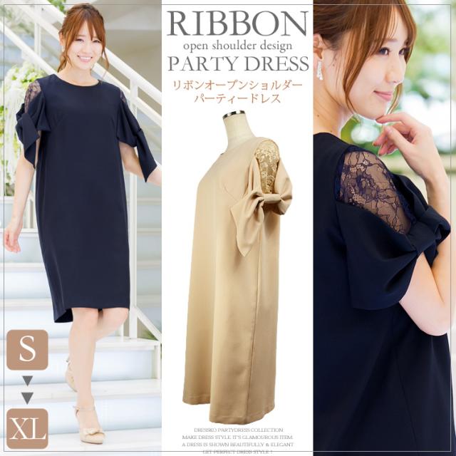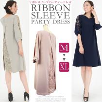 パーティードレス 結婚式 ドレス 大きいサイズ リボンスリーブ バックレース パーティードレス M L XL 結婚式ドレス お呼ばれドレス ゲス