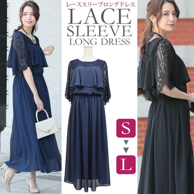 ロングドレス パーティードレス 結婚式 ドレス 大きいサイズ ドレス 送料無料 半袖 LUXEなレース重ねのフレア袖 シフォンロングドレス 4