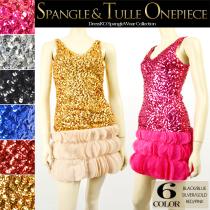 セール 値下げ ひらひらと動きのあるチュールフリル切替え◆スパンコールミニドレス・ワンピース【6COLOR】ダンス 衣装 スパンコール ワ
