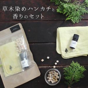 草木染めハンカチと香りのセット(選べる草木染ハンカチ・GREEN FOREST5ml・ひのきキューブ5g) 草木染め 天然染め ガーゼ 無地 タイダイ