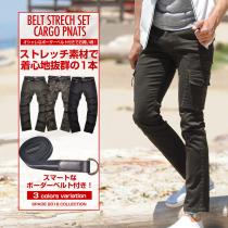 【e180】 / カーゴパンツ メンズ カーゴ スキニー スリム ストレッチ 無地 カモフラ 迷彩 カモフラージュ 黒 おしゃれ ロング ベルト付