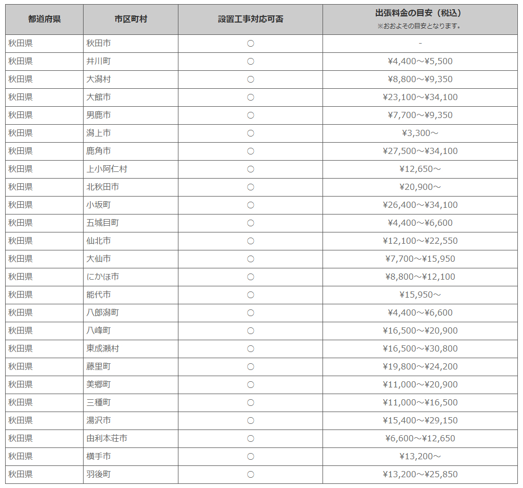 秋田県 ※離島・山間部他 一部地域は工事エリア外となります。出張料がかかる地域がございます。