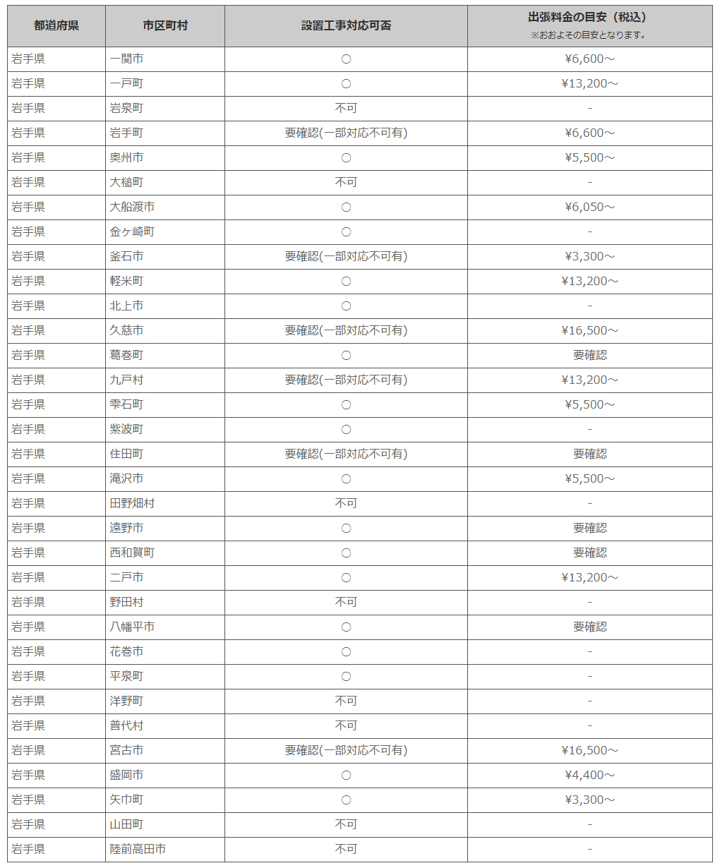 岩手県 ※離島・山間部他 一部地域は工事エリア外となります。出張料がかかる地域がございます。