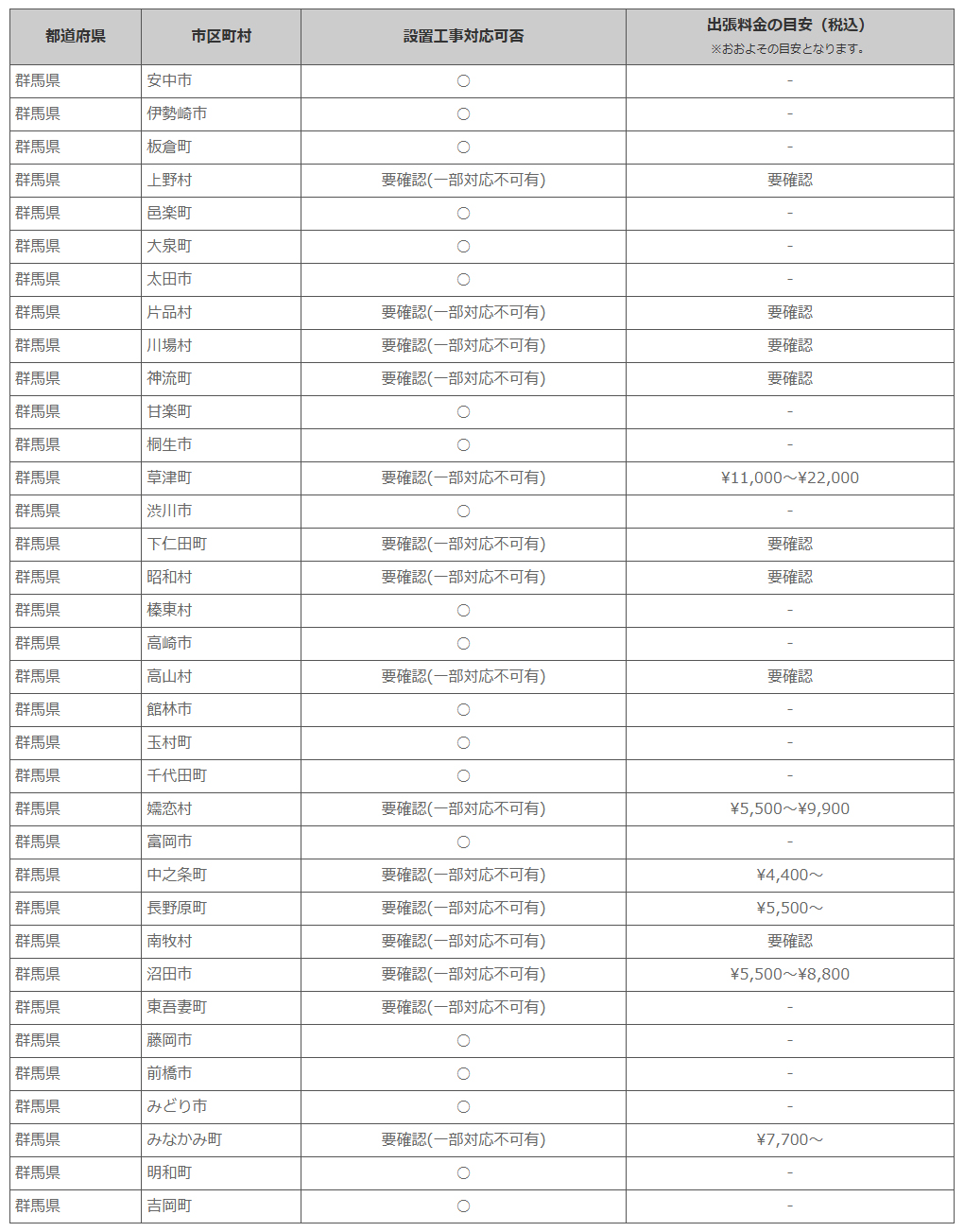 群馬県 ※離島・山間部他 一部地域は工事エリア外となります。出張料がかかる地域がございます。