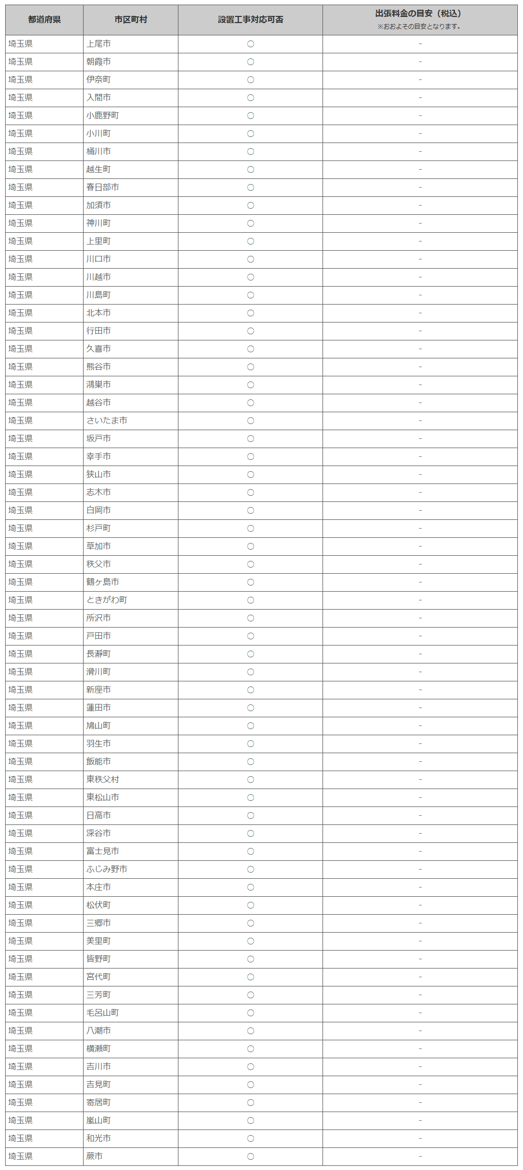 埼玉県 ※離島・山間部他 一部地域は工事エリア外となります。出張料がかかる地域がございます。