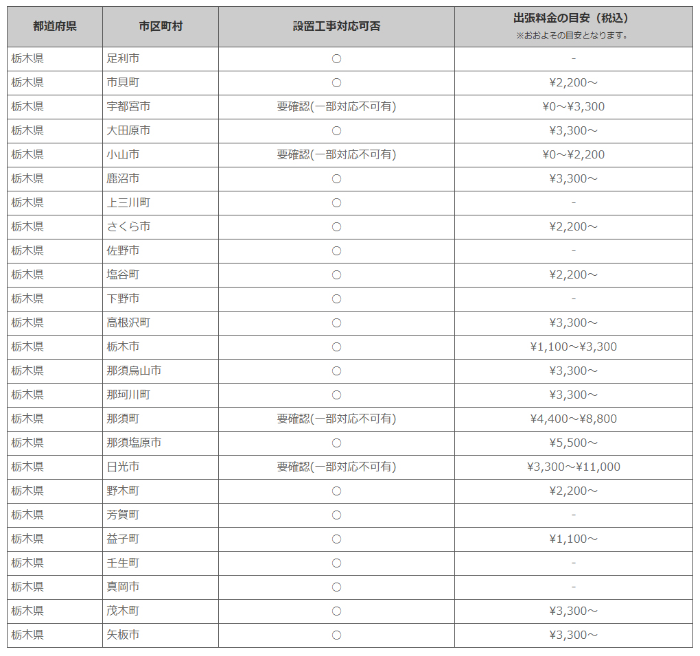 栃木県 ※離島・山間部他 一部地域は工事エリア外となります。出張料がかかる地域がございます。
