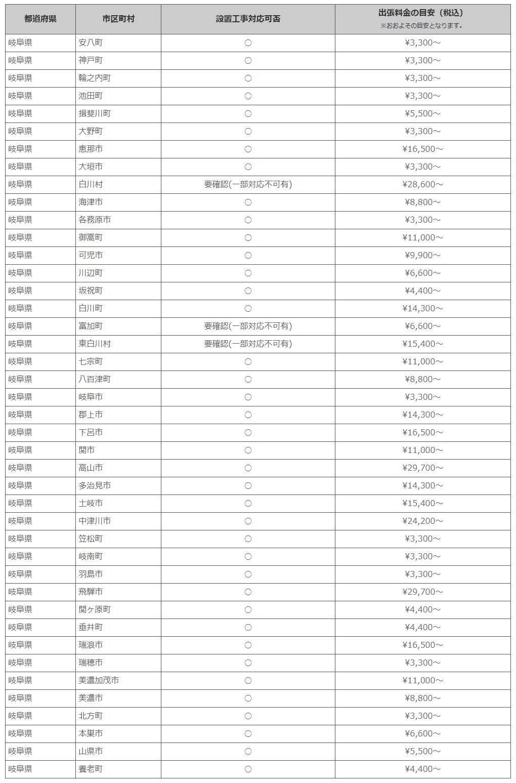 岐阜県 ※離島・山間部他 一部地域は工事エリア外となります。出張料がかかる地域がございます。