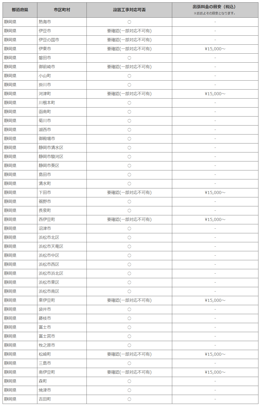 静岡県 ※離島・山間部他 一部地域は工事エリア外となります。出張料がかかる地域がございます。