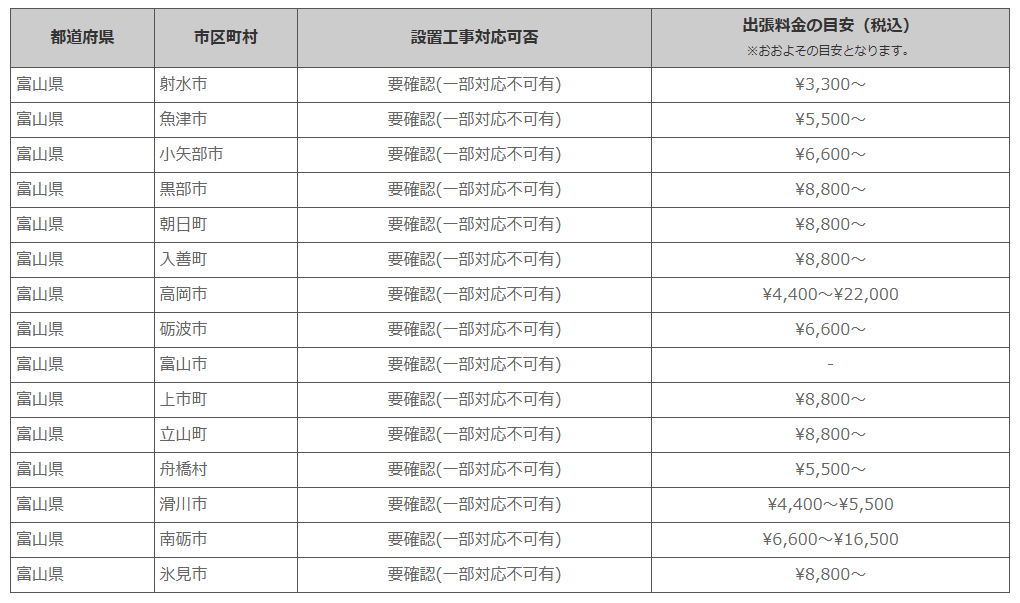 富山県 ※離島・山間部他 一部地域は工事エリア外となります。出張料がかかる地域がございます。