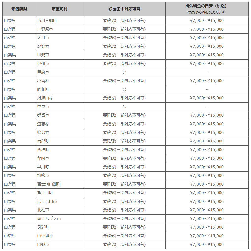 山梨県 ※離島・山間部他 一部地域は工事エリア外となります。出張料がかかる地域がございます。