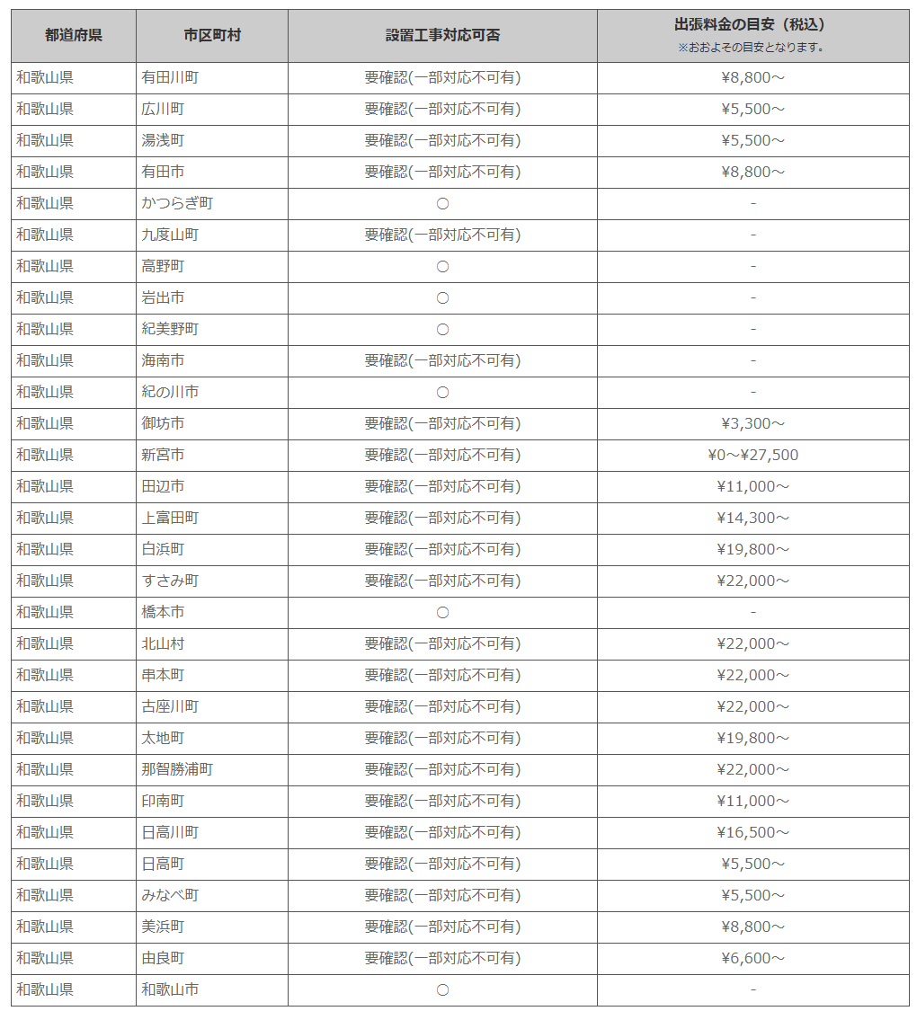 和歌山県 ※離島・山間部他 一部地域は工事エリア外となります。出張料がかかる地域がございます。