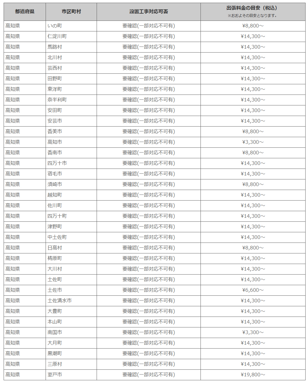 高知県 ※離島・山間部他 一部地域は工事エリア外となります。出張料がかかる地域がございます。