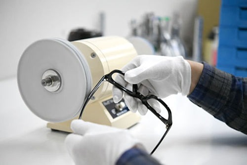 | お買い上げいただいた商品については、スタッフが一本一本目視による検品を行っています。微細な傷がついていないか、ネジが緩んでいないか、テンプル(つる)が歪んでいないかなどを細かくチェックします。 |
