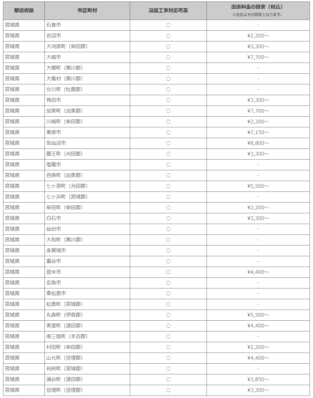 宮城県 ※離島・山間部他 一部地域は工事エリア外となります。出張料がかかる地域がございます。