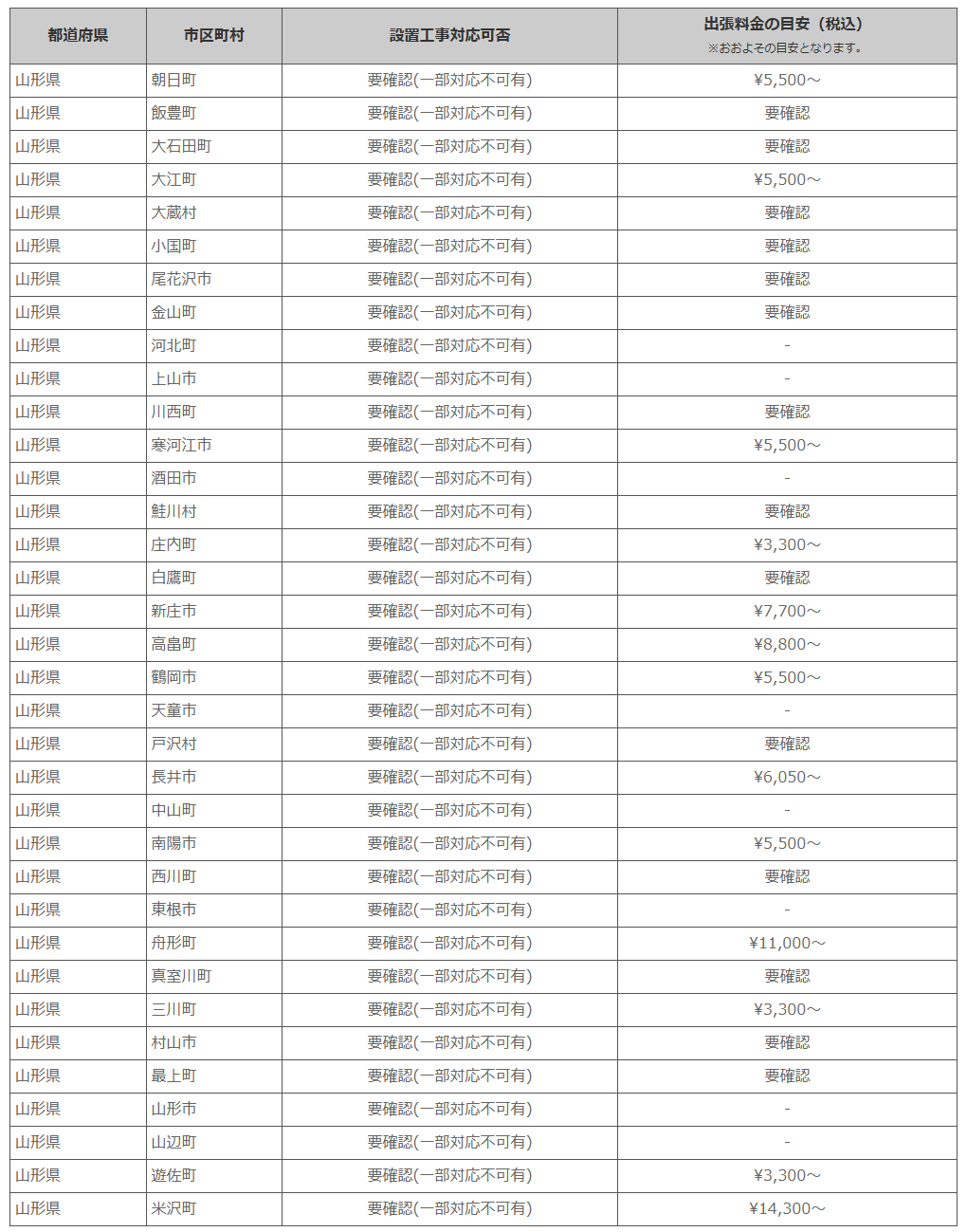 山形県 ※離島・山間部他 一部地域は工事エリア外となります。出張料がかかる地域がございます。