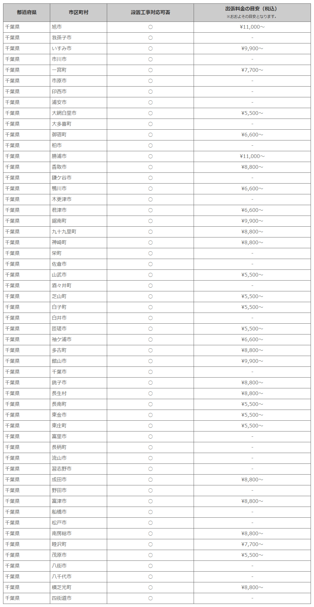 千葉県 ※離島・山間部他 一部地域は工事エリア外となります。出張料がかかる地域がございます。
