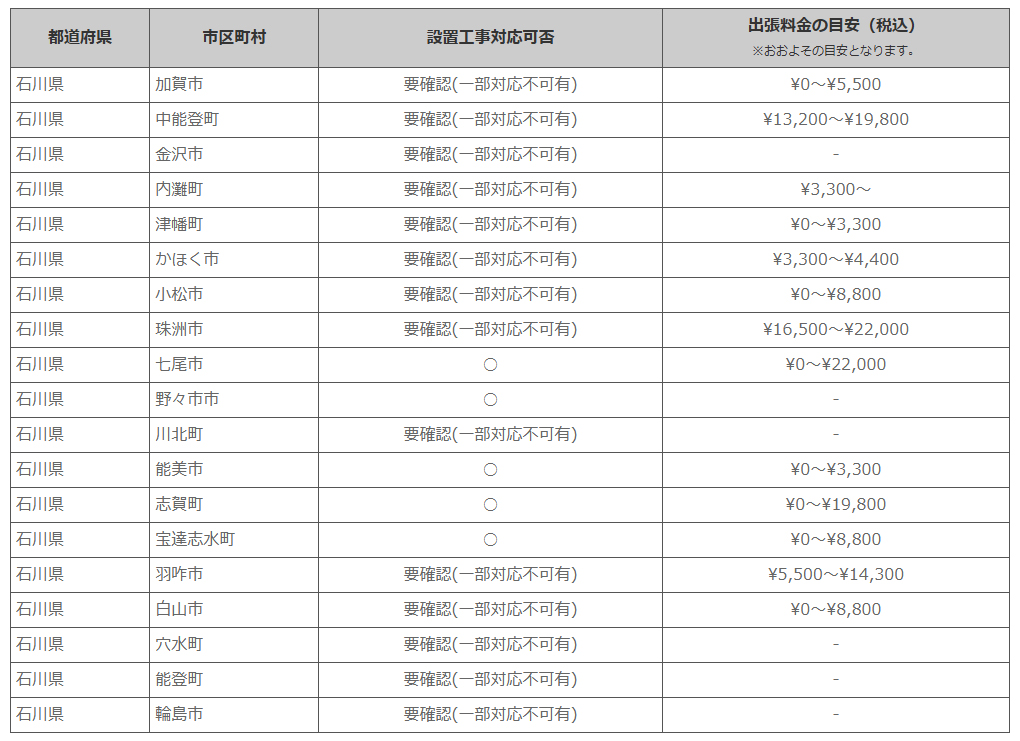 石川県 ※離島・山間部他 一部地域は工事エリア外となります。出張料がかかる地域がございます。
