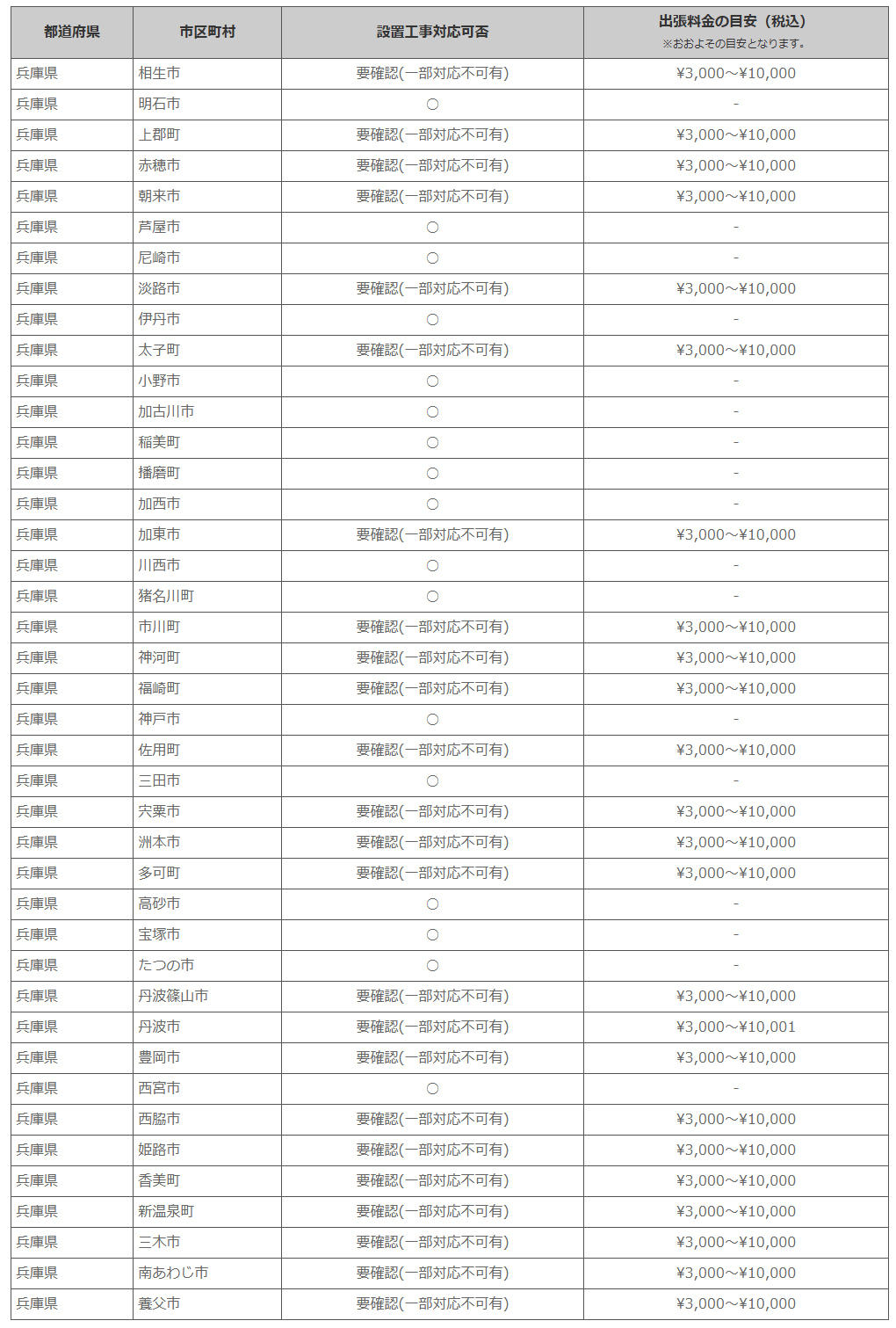 兵庫県 ※離島・山間部他 一部地域は工事エリア外となります。出張料がかかる地域がございます。