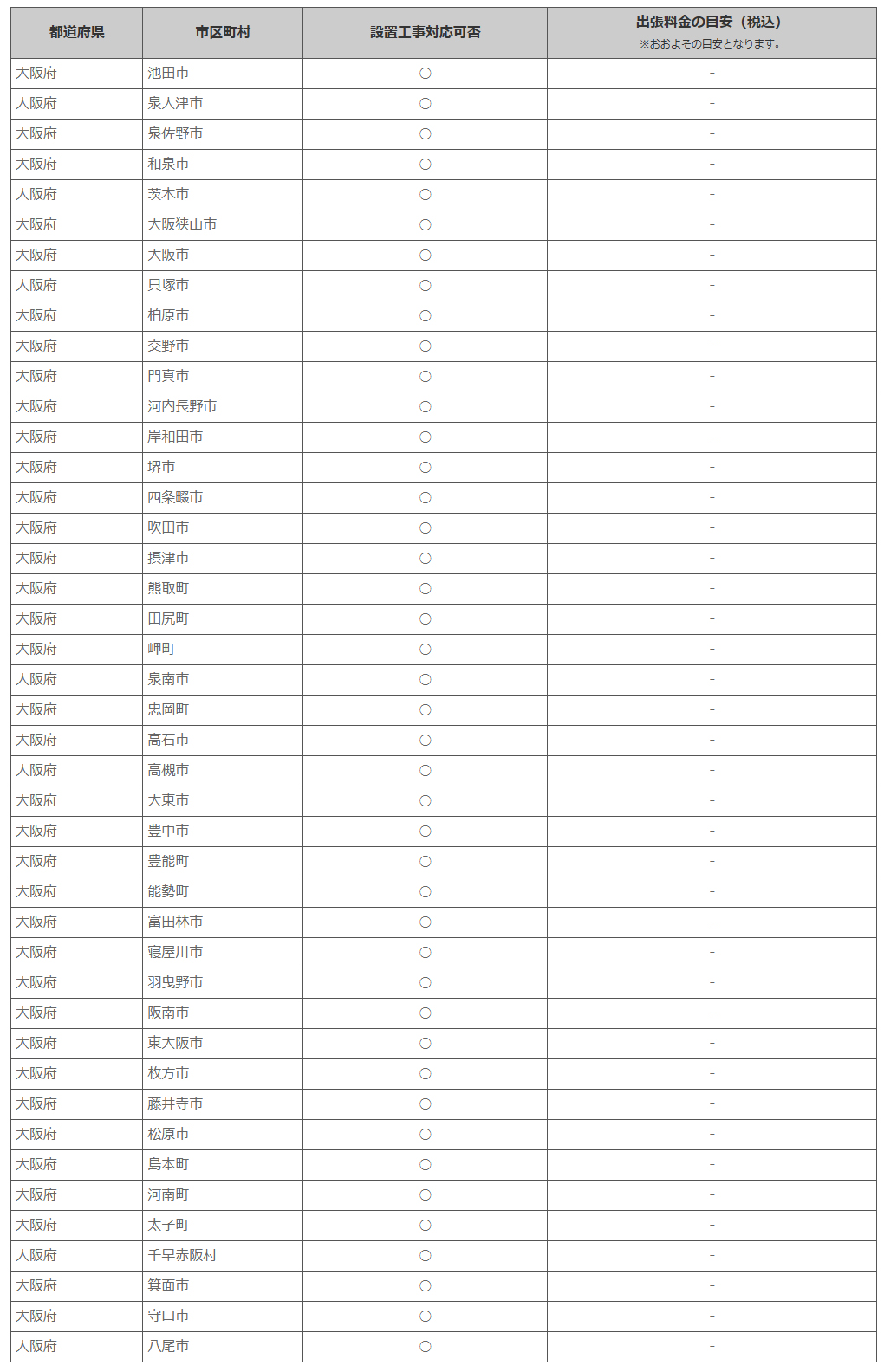 大阪府 ※離島・山間部他 一部地域は工事エリア外となります。出張料がかかる地域がございます。