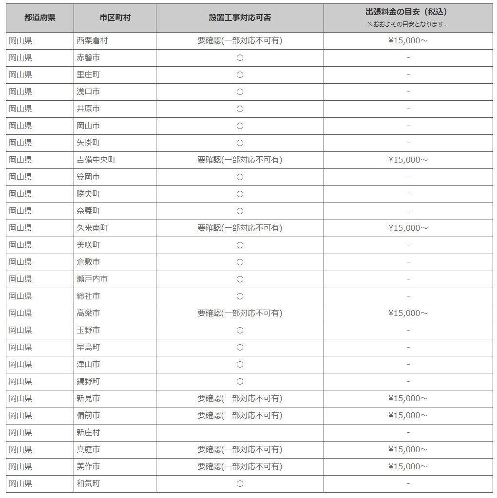 岡山県 ※離島・山間部他 一部地域は工事エリア外となります。出張料がかかる地域がございます。
