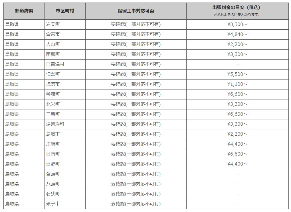鳥取県 ※離島・山間部他 一部地域は工事エリア外となります。出張料がかかる地域がございます。